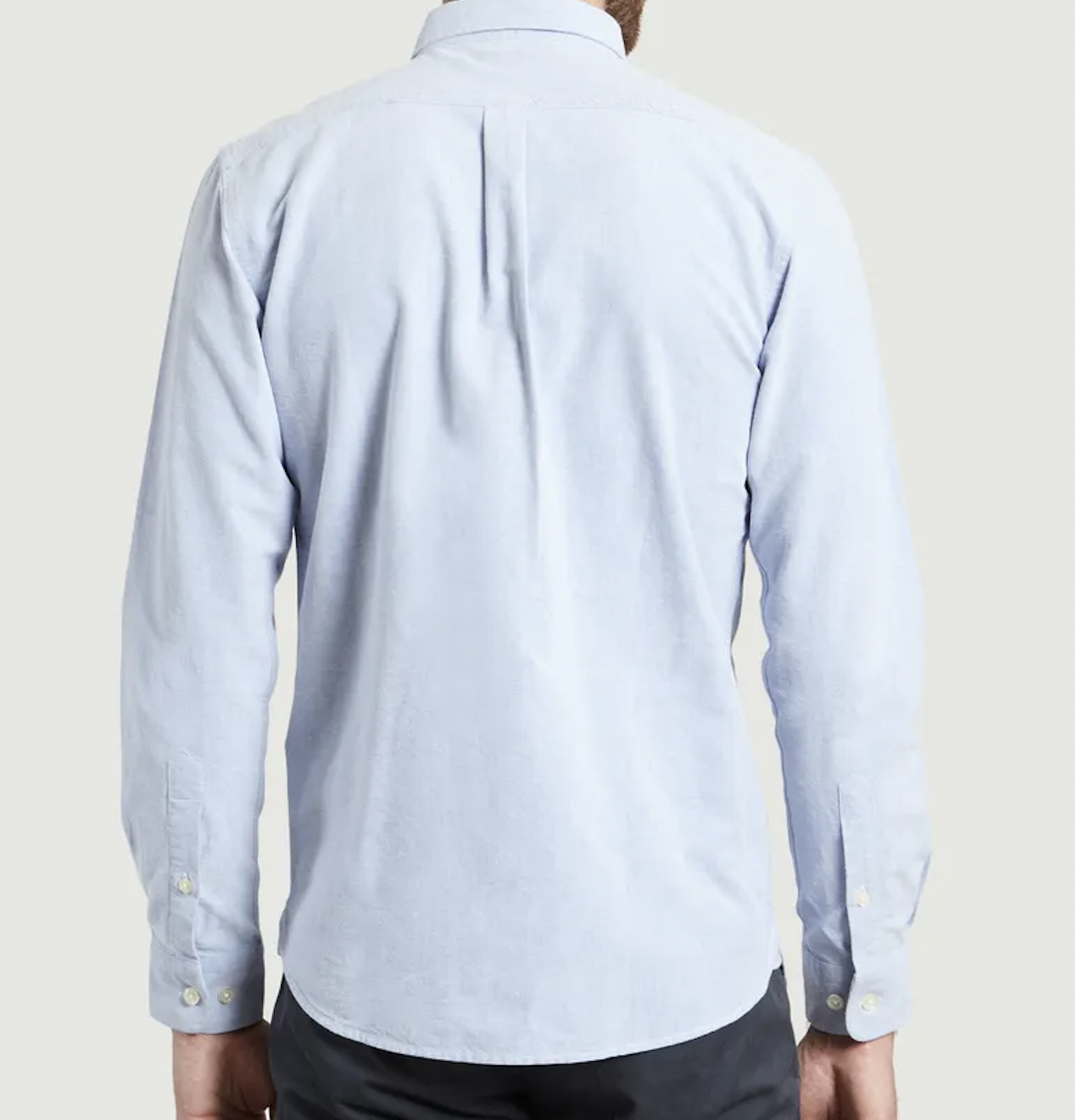 Chemise en coton biologique coloris encre, col américain, manches longues, poignets avec fente boutonnée, fermeture boutonnée à l’avant, poche poitrine plaquée, coupe slim.